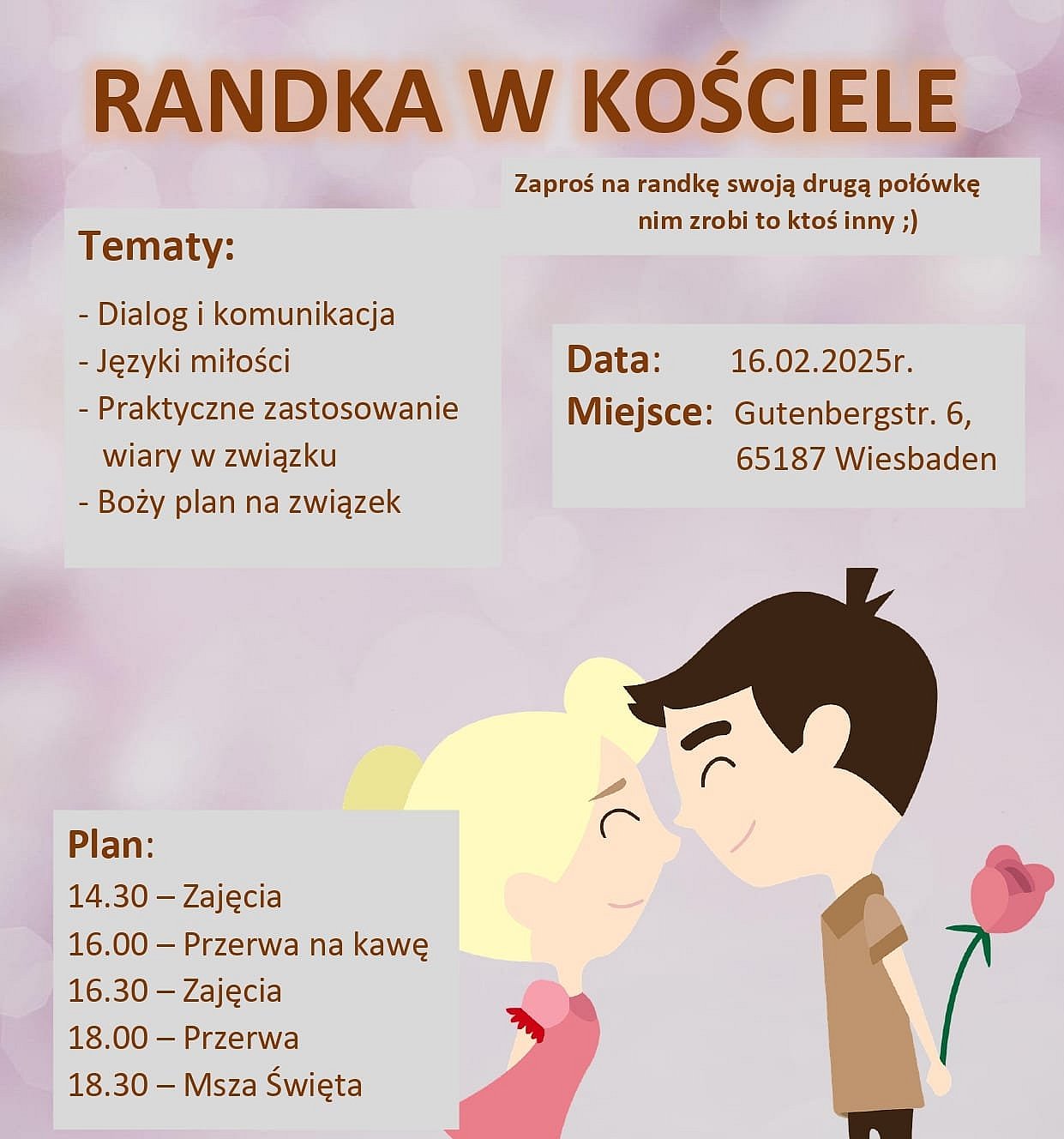 Z okazji Święta Zakochanych odbyło się spotkanie dla par w naszej misji, w czasie którego podjęliśmy temat komunikacji i dialogu. W czasie naszego spotkania odbyły sie konferencje, praca własna i z partnerem. Pogłębiliśmy temat języków miłości w małżeństwie i propozycję, którą daje nam Pan Bóg będąc we wspólnocie Kościoła. W przerwach mogliśmy skosztować pysznego ciasta i wypić kawę przy muzyce i wspaniałej atmosferze. Na zakończenie odbyła się wspólna Eucharystia, w czasie której modliliśmy się za małżeństwa i nas samych. Szczególnie dziękuję za uczestnictwo i pomoc w przygotowaniu wydarzenia.